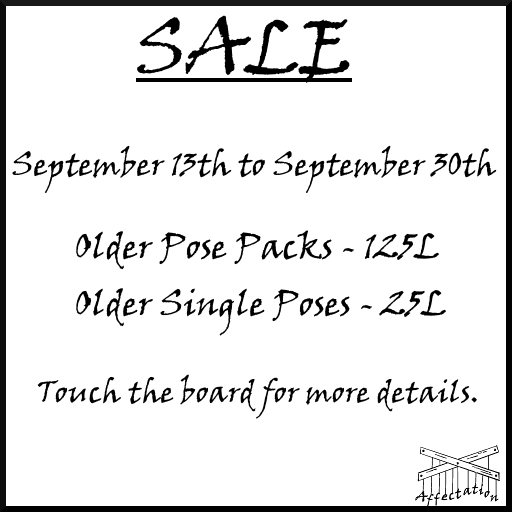 So what's in it for you? Well I have decided to set all of my older poses out for sale at half off the regular price. All older pose packs are for sale at 125L and single poses at 25L.